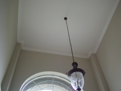 - Close-up of crown moulding installed on ceiling in front of foyer. Crown moulding was installed throughout the foyer today.