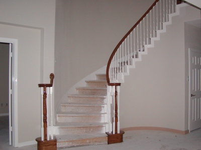 - View of newly varnished stair handrails as seen from dining room.