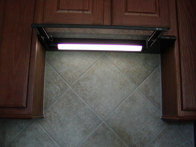 - Vent-hood above cooktop in the "on" position. It took us a while to realize how this works, but when you slide the glass part out the fan and light come on automatically - pretty cool!