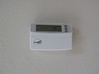 - Programmable thermostats are installed in house. This one is near the kitchen, but there is also one in the hall upstairs, and one in the master bedroom.