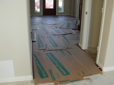 - View of foyer from family room. Wood floor has been installed in foyer and dining room, but is covered with cardboard for protection.