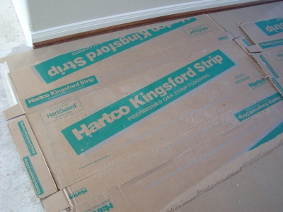 - Close-up of boxes laid on top of newly installed wood flooring in foyer.