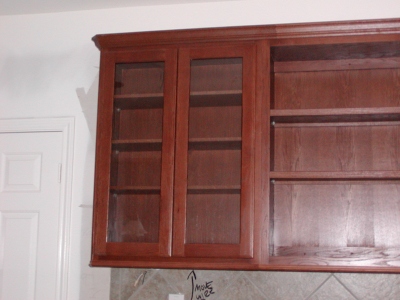 - Glass is installed in cabinets over computer desk in kitchen. Unfortunately, these are plain glass and not the leaded glass inserts that we paid for.