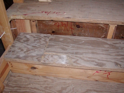 - Several stairs were replaced (by order of city inspector). Unfortunately, it looks like they used sub-standard wood on the ones they replaced. This is a picture of the top stair, which appears to be patched and glued together.