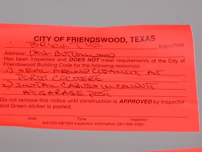 - 1 of 2 stickers for failed brick-in inspection.