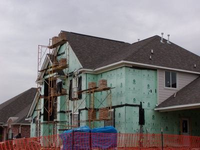 - Workers stacking bricks on scaffolding in preparation for brick-in.