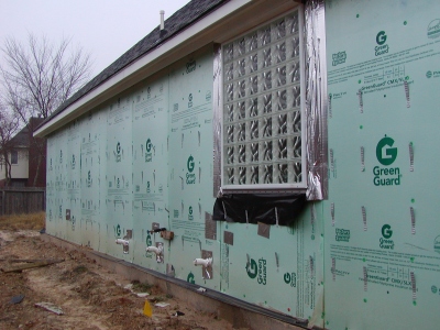 - Close-up of bathroom wall prior to brick-in. The Green Guard has been patched in several places.