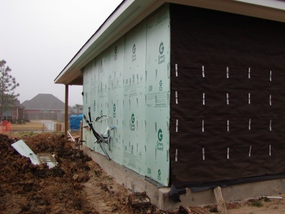 - Exterior wall of garage prior to brick-in. The wires sticking out of the garage wall are for the A/C units.