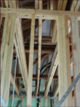 - Closeup of bowed bored in garage ceiling, which inspector recommended replacing or at least adding more bracing to.