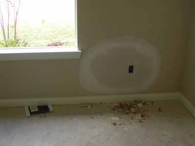 - It looks like they finally found the hidden electric plug in the guest bedroom, and had to patch a large area of sheetrock.