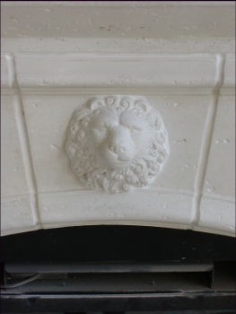 - Close-up frontal view of lion's head which was added to front of fireplace.