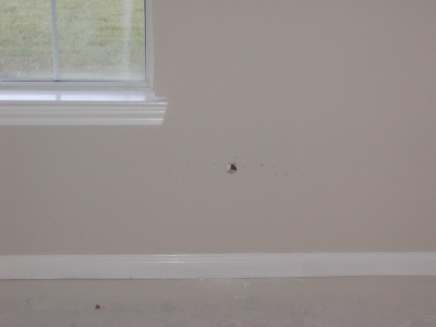 - Close-up of hole(s) in sheetrock where it looks like the electricians went on a fishing expedition for an electrical outlet. It appears as though we might be missing one?